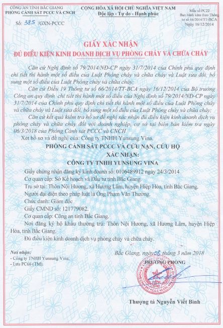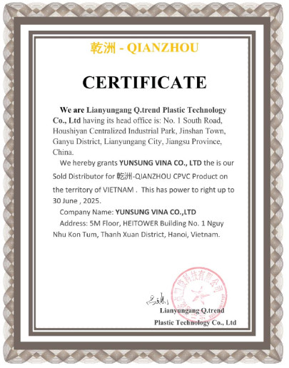 Yunsung Vina là công ty đầu tiên khập khẩu dòng sản phẩm mới- CPVC trong hệ thống chữa cháy tự động Sprinkler theo quy chuẩn QCVN 03:2021/BCA và TCVN 12653-1&2:2019. Gồm 2 dòng sản phẩm Cpvc Yunsung Vina/Trung Quốc và Cpvc Aikang /Hàn Quốc được kiểm định và cấp giấy chứng nhận kiểm định bởi cục PCCC.